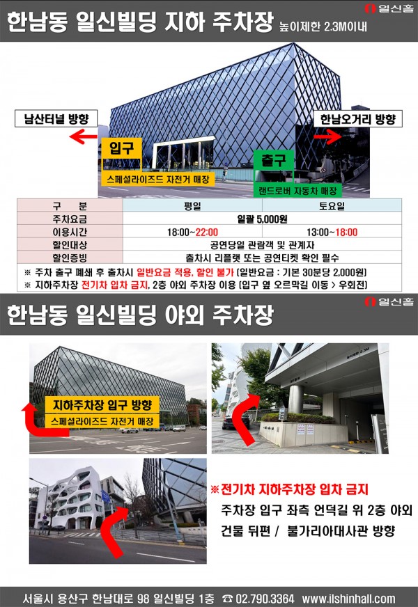 주차장 이용 및 금액은 어떻게 되나요? 페이지 정보 작성자 일신홀 작성일18-05-31 11:30 조회27,923회 댓글0건 관련링크 이전글 다음글 목록 본문 주소 : 서울시 용산구 한남대로 98(한남동 714) 일신빌딩 1층 Tel : 02-790-3364 이전글 다음글 목록